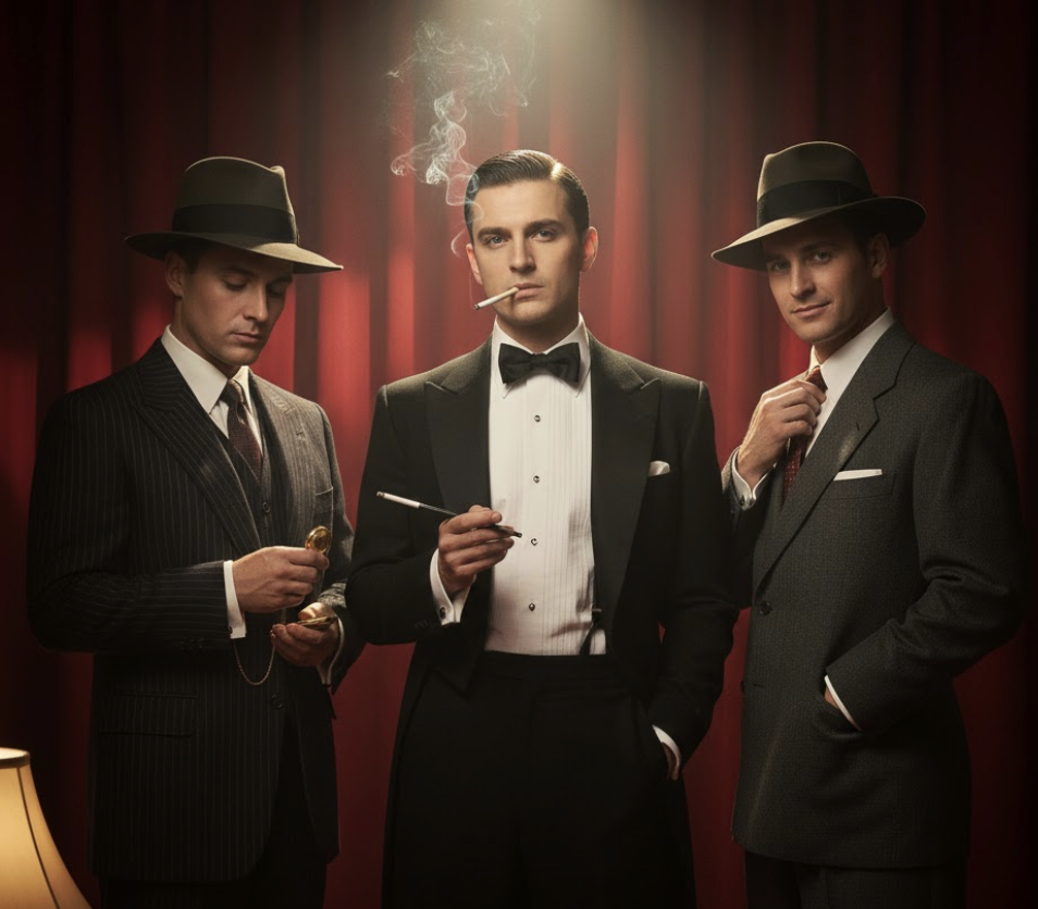 For men: tuxedos or sharp suits, suspenders, and fedoras. A cigarette holder or pocket watch is the cherry on top. You’re not just attending a party—you’re starring in a mystery.