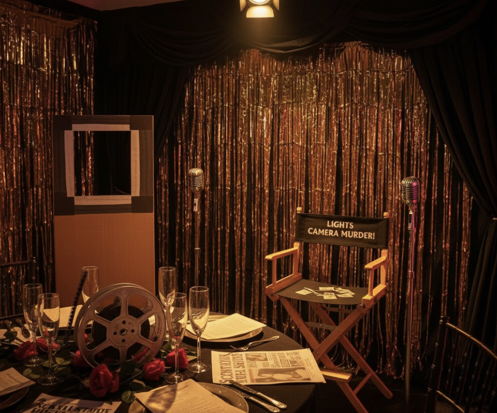 Use warm lighting, gold accents, and shadows deep enough to hide a scandal. Hang a “Studio 13” sign over the doorway or set up a clapboard prop where guests can pose for photos. Add an old typewriter on a side table, a fake Oscar or two, and dim jazz crooning through the background. Voilà—instant 1930s intrigue.